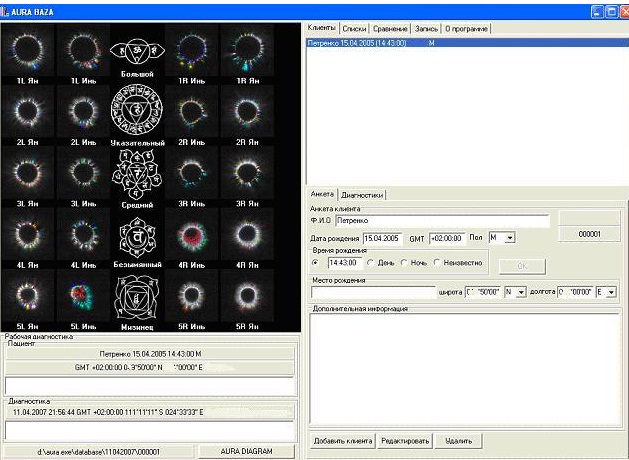 AURA DATE BASE – Preservation of the original and processed information in a compressed form; searching and sorting of the data by significant features. The operation of all the programs of the software complex. This program is the shell that unites all the other programs of the complex and allows you to conveniently operate on the data.