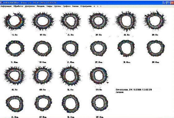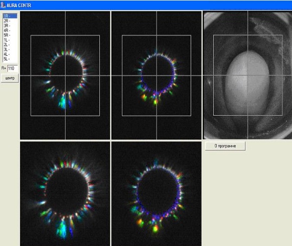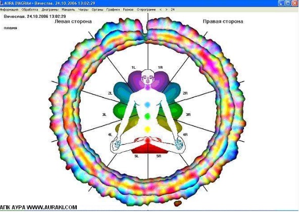 AURA DIAGRAMS – Processing of the initial files which are obtained from capturing glow images around the tips of ten fingers of a human's hand, based on a diagnostic map of the correspondence between the areas of glowing of the fingertips of a human's hands with the state of his systems and organs; construction of a three-dimensional virtual aura around the human body based on the initial data and model according to the known diagnostic map; monitoring of the state of the main systems and human organs based on the parameters of the original images obtained from ten human fingers and a graphical representation of the complex parameters of the luminescence images of the object according to the calculated statistical parameters of the object, for example, for the testing the complex.