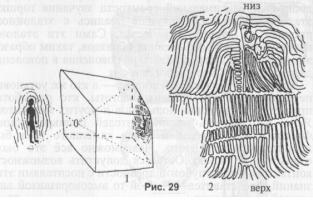 В целом, весь этот «магический портрет» (как его называет автор публикации Г. Бар), по-видимому, представляет собой специальный вибратор, создающий объёмную модель энергетических полей человека. Характерно, что этот рельефный рисунок нанесён на стенку дольмена «вверх ногами». Это объясняется, с нашей точки зрения, тем, что дольмен представляет собой, по сути, камеру-обскуру. Ультразвуковой «портрет», создаваемый задней стенкой дольмена, преломляясь через отверстие в его передней стенке, «переворачивался», и человек, становившийся в фокусной точке этой камеры, совмещался с ультразвуковым образом (рис. 29, /). Вероятно, в процессе лечебного сеанса ультразвуковое воздействие на энергетические центры человека приводило его здоровье в норму.