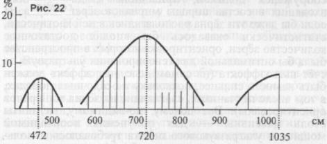 Автор попытался рассматривать дольмены как объёмные акустические полости (резонаторы Гелъмгольца) и исходя из этого выяснить, на какие резонансные частоты они были рассчитаны. Резонансная частота акустической полости зависит от её наибольшего периметра, каковым в дольменной камере является её периметр в нижней части, у пола16. Построив график-гистограмму периметров камер кавказских дольменов на основе данных из вышеуказанной монографии В. И. Марковина, мы получили неожиданный результат (рис. 22). Оказалось, что среди более чем двух тысяч этих сооружений преобладают постройки трёх типов. Наиболее часто (статистически наиболее достоверно) встречаются дольмены, периметр камеры которых составляет 720 см. Помимо этой группы встречаются (статистически менее достоверно) более крупные постройки с периметром камеры 1035 см и меньшего размера, периметр которых составляет 472 см. Резонансные частоты таких камер соответственно равны 23, 16 и 35 Гц. Иными словами, если бы каким-то способом к этим дольменам (резонаторам) была подведена энергия, то они звучали бы именно на таких частотах.