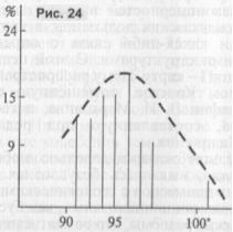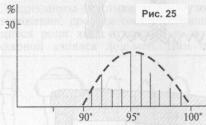 луча (прожекторный эффект), о чём свидетельствуют конструктивные особенности дольменов. Камера дольмена представляет собой раструб, расширяющийся в направлении от задней стенки к передней. Сттистическая обработка данных, касающихся западнокав-казских дольменов, показала, что при всём разнообразии размеров дольменов углы раствора камер у них выдержаны (рис. 24). А именно, угол горизонтального раствора камеры в среднем составляет 94,4°, угол наклона крыши — 95,4° (рис. 25).