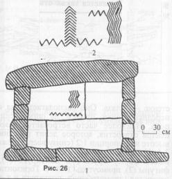 стенке «лаз». Оно располагается на осевой линии передней стенки, причём, на определённой высоте от пола. Наиболее часто встречается такое положение центра отверстия, которое делит переднюю стенку по высоте в пропорции 1:2 (снизу вверх), реже в пропорции 3:4. Из 25 рассмотренных нами случаев это отверстие имеет форму круга (8), полукруга (6), яйцевидной фигуры (2), прямоугольника (1). Горизонтальный размер отверстия (диаметр круга, полукруга и т. п.) чаще всего равен 40 см.