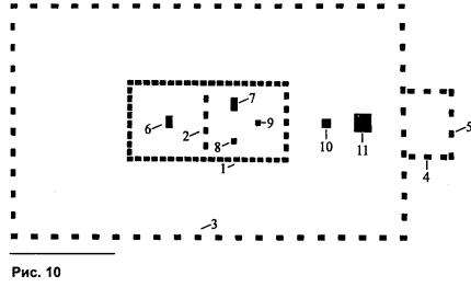 Согласно библейским текстам, смонтированная на местности скиния представляла собой строго ориентированное по сторонам света (вытянутое с запада на восток) прямоугольное сооружение размером 28 х 40 локтей. План скинии, по описаниям Иосифа Флавия3, приведен на рис. 10, где 1—5 — это брусья самой скинии, её двора