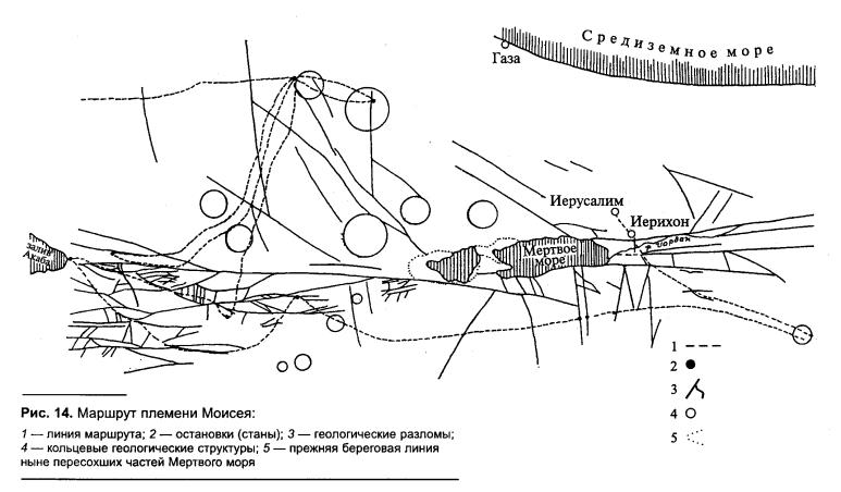 Автором произведено дешифрирование американского космического снимка этой территории, некоторые результаты которого нанесены на карту Д. Берёзкина (рис. 14). Показаны активные разломы и кольцевые структуры, хорошо читающиеся (дешифрирующиеся) на космоснимке. Маршрут племени Моисея, совмещённый со схемой дешифрирования космоснимка, убеждает в том, что целью всех этих «блужданий» и «зигзагов» было нащупывание наиболее энергетически насыщенных участков, каковыми, как сегодня известно, являются разломы, особенно их пересечения и концевые зоны, некоторые участки кольцевых структур и др.