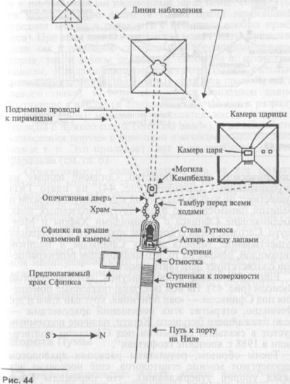 эзотерического толка общество. Согласно одному из опубликованных рисунков (рис. 44), на плато Гиза существует не только подземный ход между Сфинксом и Великой пирамидой, но и два других подземных хода, соединяющие Сфинкса с пирамидами Хафры и Мен-каура. Сегодня, когда египетские археологи подтвердили существование тоннеля между Сфинксом и Великой пирамидой, похоже на то, что информация розенкрейцеров соответствует действительности.