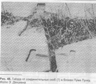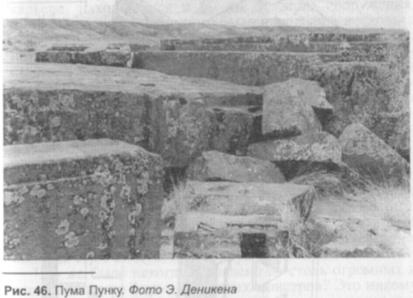 бы изготовить столь сложную по форме многотонную деталь из твердейшего диорита! Э. фон Деникен19 отмечал в этой связи, что когда он показал фотоснимки блоков из Пума Пунку современному мастеру, изготавливающему из природного камня надгробные памятники, тот заявил, что он со всеми своими алмазными циркулярными пилами, свёрлами и фрезами не в состоянии изготовить столь крупный и сложный по форме предмет из каменного монолита...
