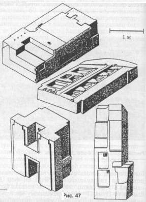 На некоторых парных блоках вырезаны фигурные углубления, в которые явно вставлялись какие-то соединительные элементы типа скоб (рис. 48). Из какого материала были изготовлены эти скобы - - неизвестно, неизвестно и их назначение --то ли соединять блоки воедино механически, то ли служить какими-то «контактами».