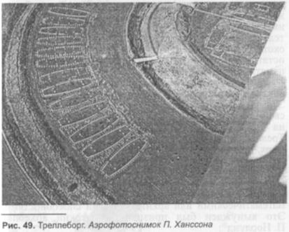 воображении. Здесь нет никаких признаков оборонительного сооружения, крепости, каковой является любой замок — высоких стен, амбразур, рвов с водой и т. п. Это сооружение представляет собой систему из четырёх концентрических круглых каменно-земляных валов и неглубоких рвов, радиус наиболее крупного из которых— 136 м. Внутренний круг разделен крестообразно пересекающимися канавами на четыре квадранта одинаковой величины. В этих квадрантах размещено по четыре помеченных камнями фигуры. Датские археологи назвали их «корабликами» (рис. 49). Два из них располагаются своими осями в направлении север-юг, а два других в направлении восток—запад. 13 таких же «корабликов» располагаются между третьим и четвёртым кругами, в том квадранте, что находится между направлениями на восток и на юг, причём оси всех этих «корабликов» направлены на центр всей системы кругов Треллеборга. Плюс ко всему в восточной части промежутка между третьим и четвёртым кругами есть ещё два таких же «кораблика», располагающихся своими осями параллельно канаве восток—запад. Вот и
