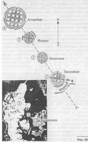 Все эти «замки викингов» по своему строению ничем не отличаются от Треллеборга, разве что размерами и некоторыми деталями. В них наблюдаются такие же системы концентрических каменно-земляных валов и рвов, разделённых на четыре квадранта, в которых размещены пресловутые «кораблики» (рис. 50). Крупнее других «замков» Аггерсборг, внутри которого размещено не 16, а 48 «корабликов». Длина этой линии (расстояние от Треллеборга до Аггерсборга) составляет ни много ни мало — 218,5 км. Все крестообразные структуры боргов взаимно параллельны, причём одна крестовина направлена по азимуту СВ10°, а вторая соответственно — СЗ 280°, т. е. разница с направлениями на север и запад составляет 10 градусов.