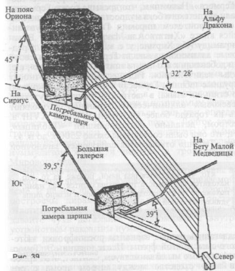 В стены камеры царя открываются две «вентиляционные шахты». Расчёты астрономов показали, что они нацелены на определённые небесные светила в 2450 г. дон. э.: южная --на звезду дзета Ориона (нижняя из звёзд пояса Ориона, или Ал-Нитак согласно арабским источникам), а северная --на альфу Дракона (или Ту-бан), которая в 2450 г. до н. э. была «полюсом мира», т. с. выполняла ту же роль, которую ныне выполняет Полярная звезда.