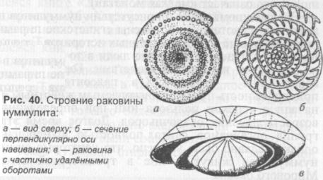 Однако, на наш взгляд, роль раковины нуммулита одним этим (служить «поплавком» для живой клетки) не исчерпывается. О том, что она (раковина) выполняла ещё какие-то функции, свидетельствуют некоторые детали её строения. На разрезе, перпендикулярном к плоскости симметрии нуммулита (рис. 42, 2), видны т. н. столбики - палочковидные стержни, начинающиеся от некоторых камер и проходящие перпендикулярно к поверхности раковины, пронизывая её оборот за оборотом. Иными словами, по мере роста раковины наращивались