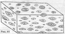 Раковина живого нуммулита парит в толще воды в вертикальном положении (т. е. диск располагается вертикально), после смерти живой клетки её камеры заполняются водой, она теряет плавучесть и падает на дно, где захороняется в осадке уже в горизонтальном положении. Таким образом, нуммулитовый известняк представляет собой породу с анизотропными (т. с. разными в разных направлениях) свойствами, ибо в ней присутствуют многочисленные субпараллельно ориентированные раковинки (рис. 41). Напомним, что в других мегалитических постройках — дольменах, менгирах (см. главу «Мегалитъ») — использовались горные породы также с анизотропными свойствами за счёт рассеянных в них ориентированных кристалликов кварца.
